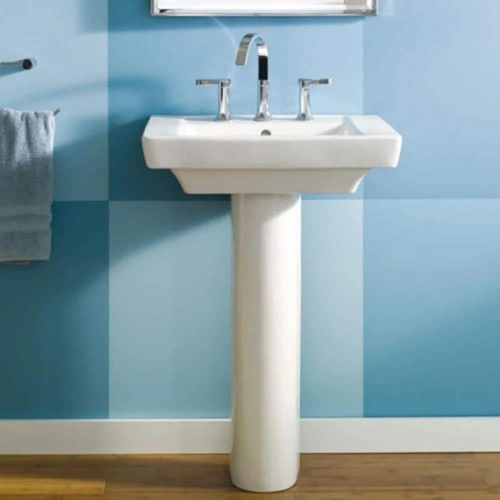 A bold, sophisticated classic. This striking rectangular pedestal sink from the Boulevard Suite brings a touch of uptown flair to any bathroom. It’s ergonomic Right Height design helps prevent back strain. Made from high-gloss, stain-resistant vitreous china. Available with a single hole or 4 in. or 8 in. center faucet holes.