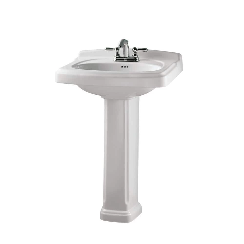 This American Standard Portsmouth 10 in. Pedestal Sink Basin in White features an integrated faucet ledge with pre-drilled holes on 4 in. centers to accommodate the installation of a faucet. A large deck offers plenty of room for keeping toiletries on hand for added convenience. The vitreous china material offers a stain-resistant surface for ease of maintenance. The basin is designed to install with a Portsmouth pedestal (sold separately).