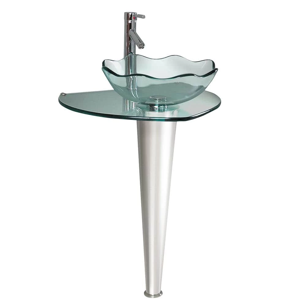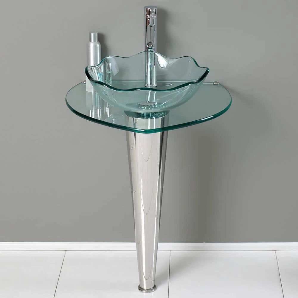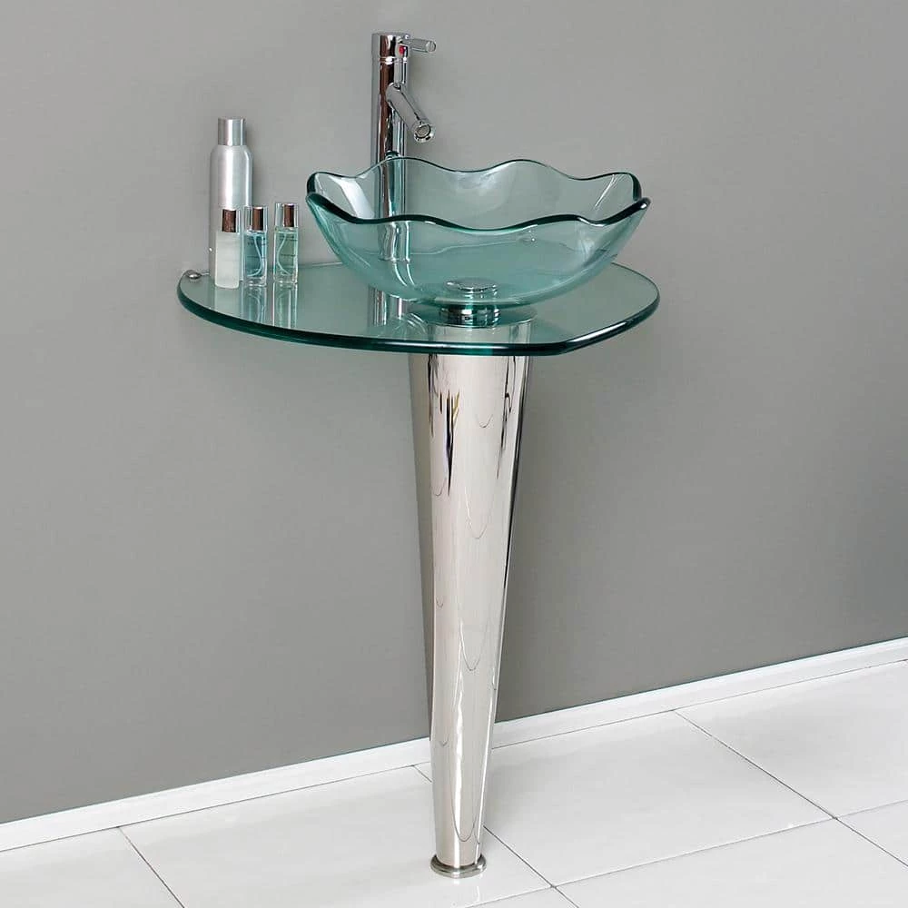 This modern glass pedestal sink is simple yet stunning. It features a beautiful scalloped edge glass vessel basin and a lovely tempered glass countertop with a single hole faucet mount. The sleek chrome stand tapers from top to bottom, adding an elegant touch to the design. It would blend beautifully into any bathroom. The pedestal vanity measures 24 in. W.