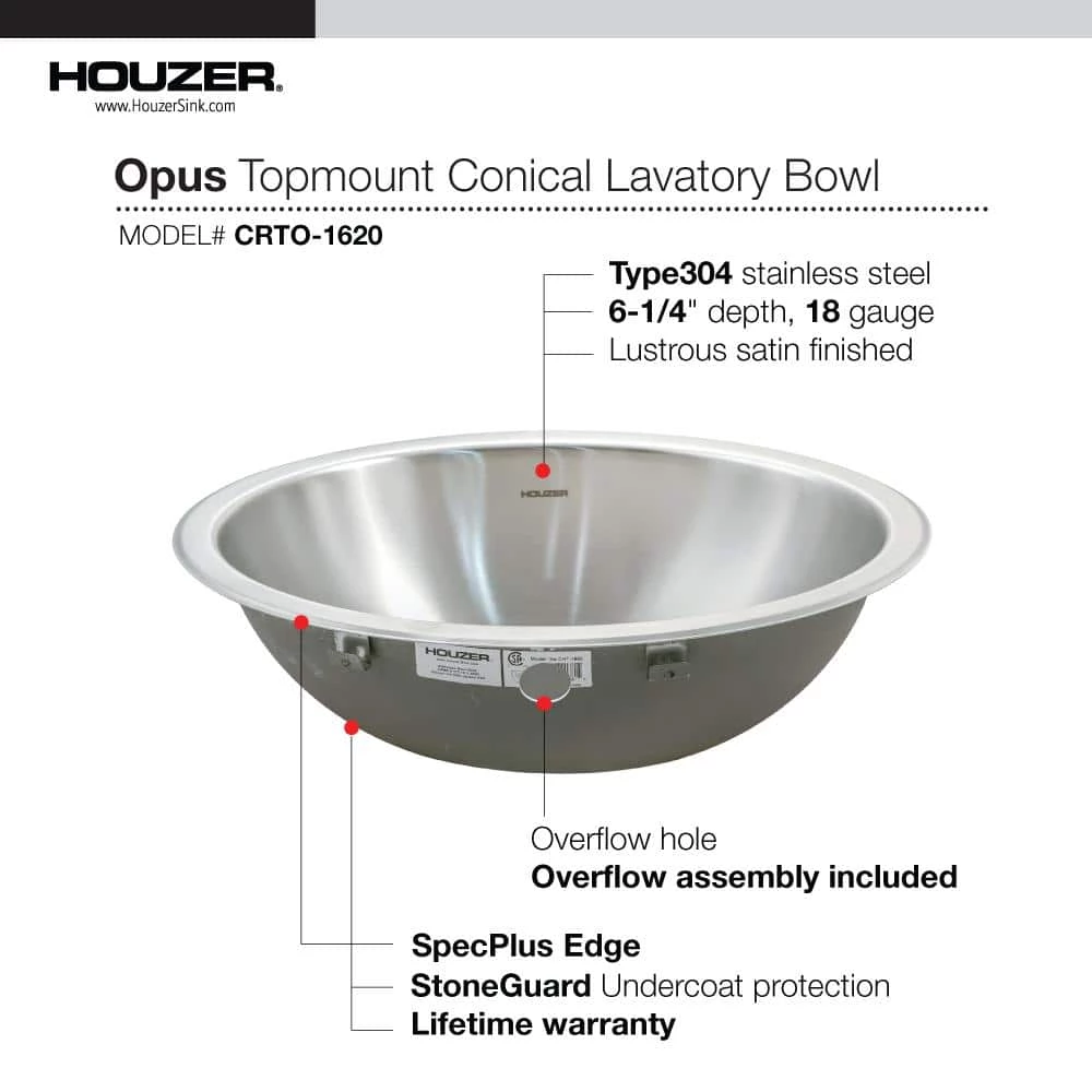 The Opus Conical Top mount Stainless Steel 16.75×6.25×16.75 in. Single Bowl Lavatory Sink features a lustrous satin finish that protects against water, food and chemical corrosion and complements your home decor. Made with 18-Gauge stainless steel, this product includes a mounting clip and comes with a lifetime limited warranty that protects against defects in material and workmanship.