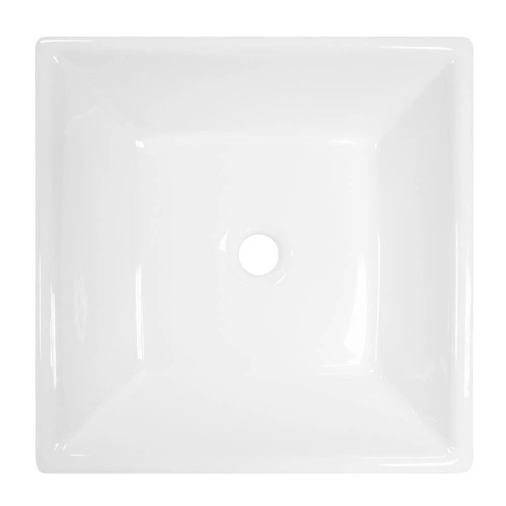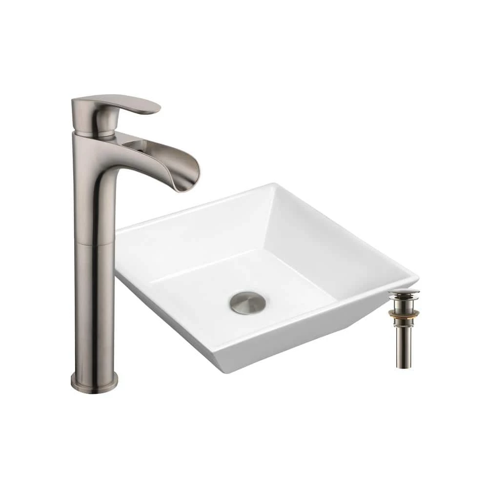 A modern bath fixture with major design appeal, this square bathroom sink is an instant standout on vanity tops throughout the home. The inverted angles of the inner basin direct water toward the center of the bowl for optimal drainage in a powder room or master bath. With zero pre-drilled faucet holes, the versatile vessel bowl design is pairs perfectly with deck-mount and wall-mount faucets alike, offering endless possibilities to coordinate plumbing fixtures. The all-in-ine sink kit includes a pop-up drain and waterfall faucet in a brushed nickel finish.