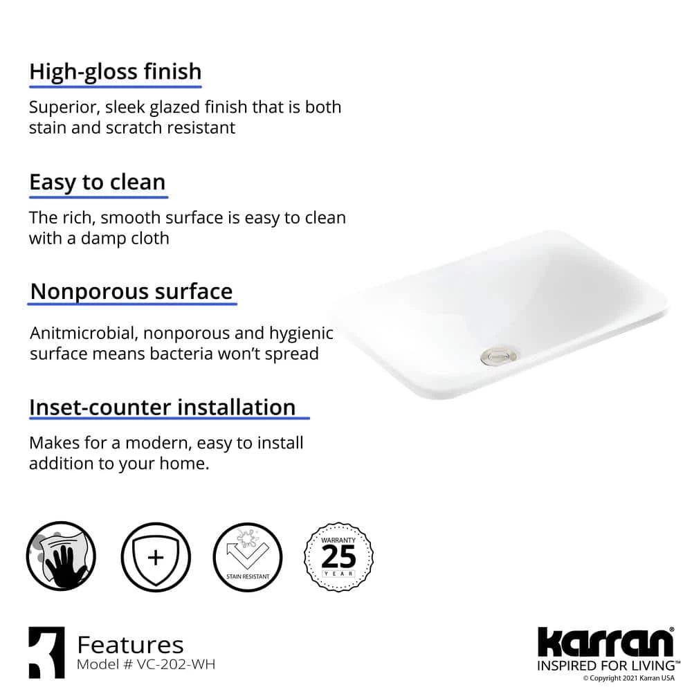 Featuring a double-glazed, high gloss finish, this elegant vitreous china vanity bowl is the perfect combination of durability, style and value. With a pure white, low maintenance finish, it makes the perfect choice for your new bathroom. Simple to install and simple to clean, this sinks nonporous glazed surface will provide you with years of trouble-free use.