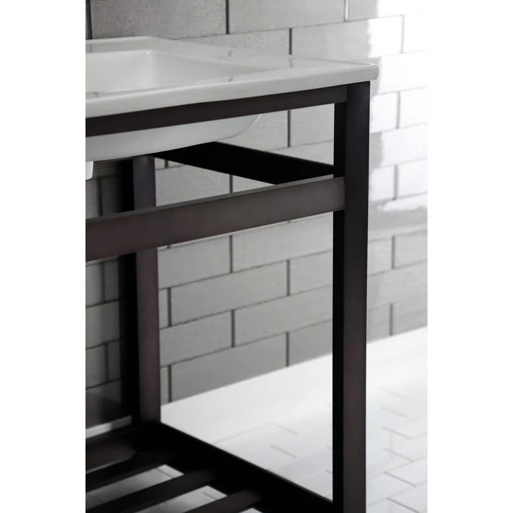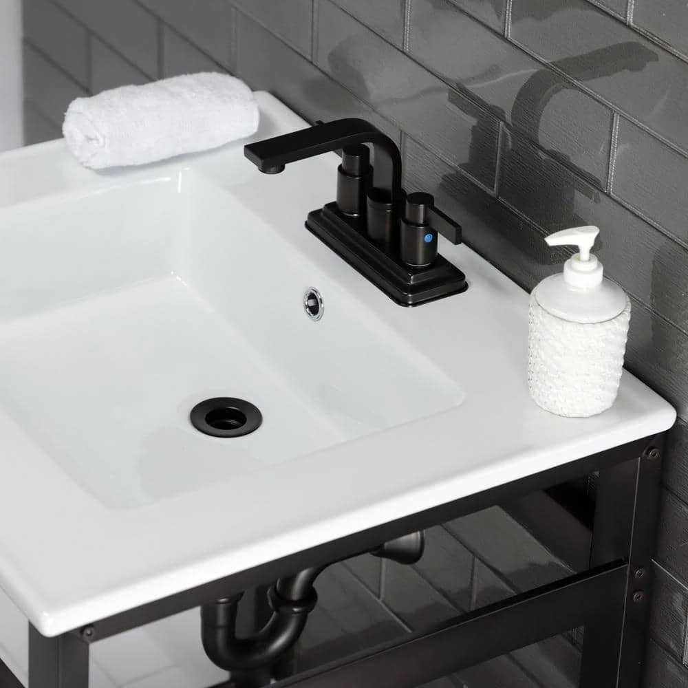Exquisitely styled for your contemporary taste, this console sink will enhance your bathroom living space. With a beautiful ceramic counter top, this console sink set is a long lasting, durable, and elegant addition to your bathroom. The Kingston Brass 25 in. ceramic console sink (4 in., 3-hole) features a wash basin and steel base that is available in a handful of finish options. Their pristine, stain-resistant surface and glistening finish make for a very sturdy fixture that is easily maintained. Water supply kit, drain assembly, and the faucet are sold separately.