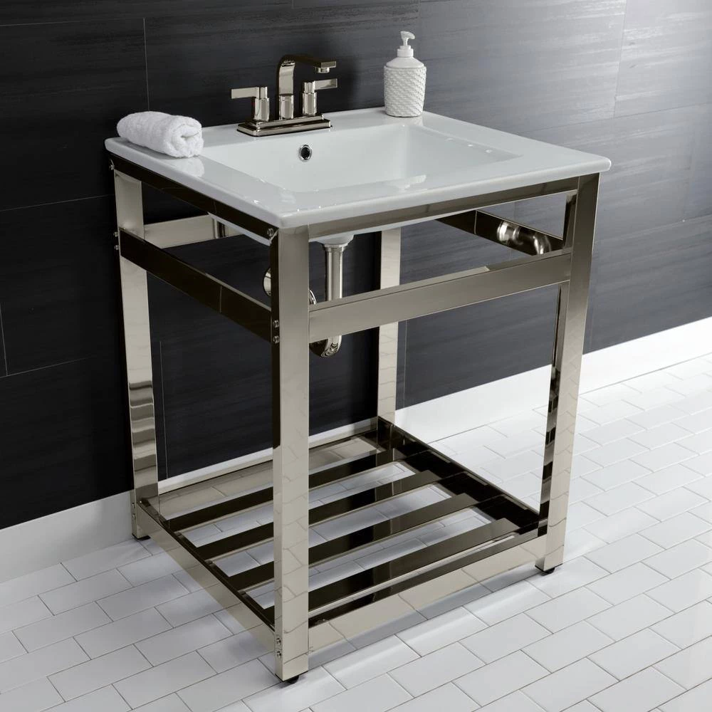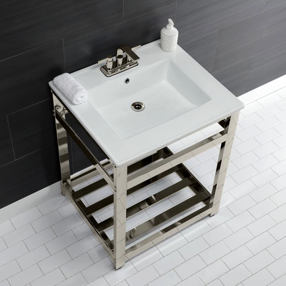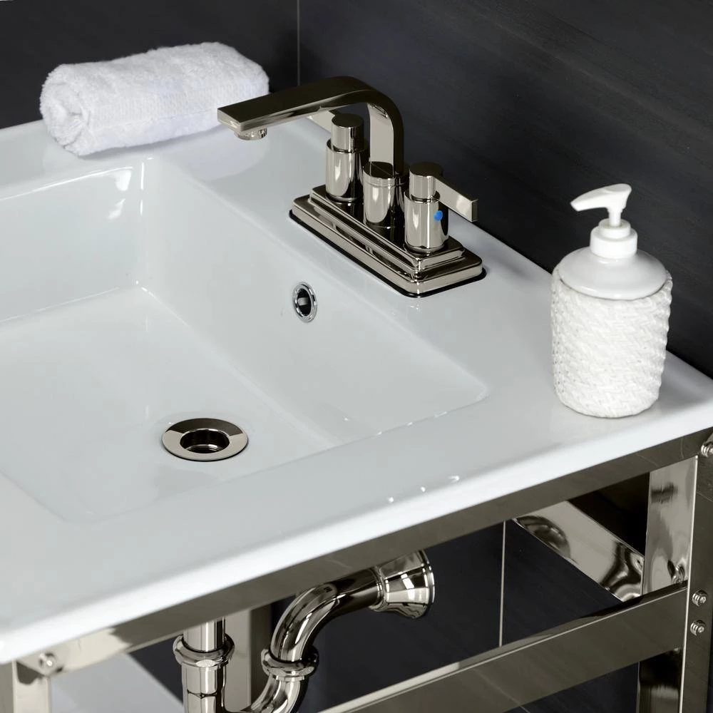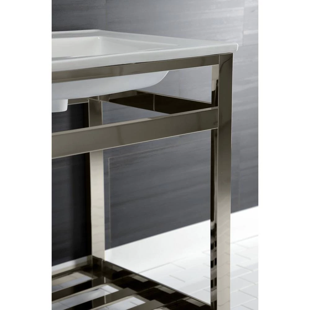 Kingston Brass 25 in. Ceramic Console Sink (4 in. in 3-Hole) with Stainless Steel Base in Polished Nickel