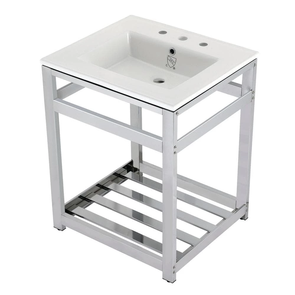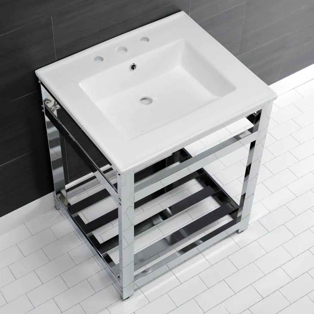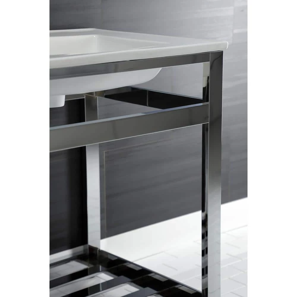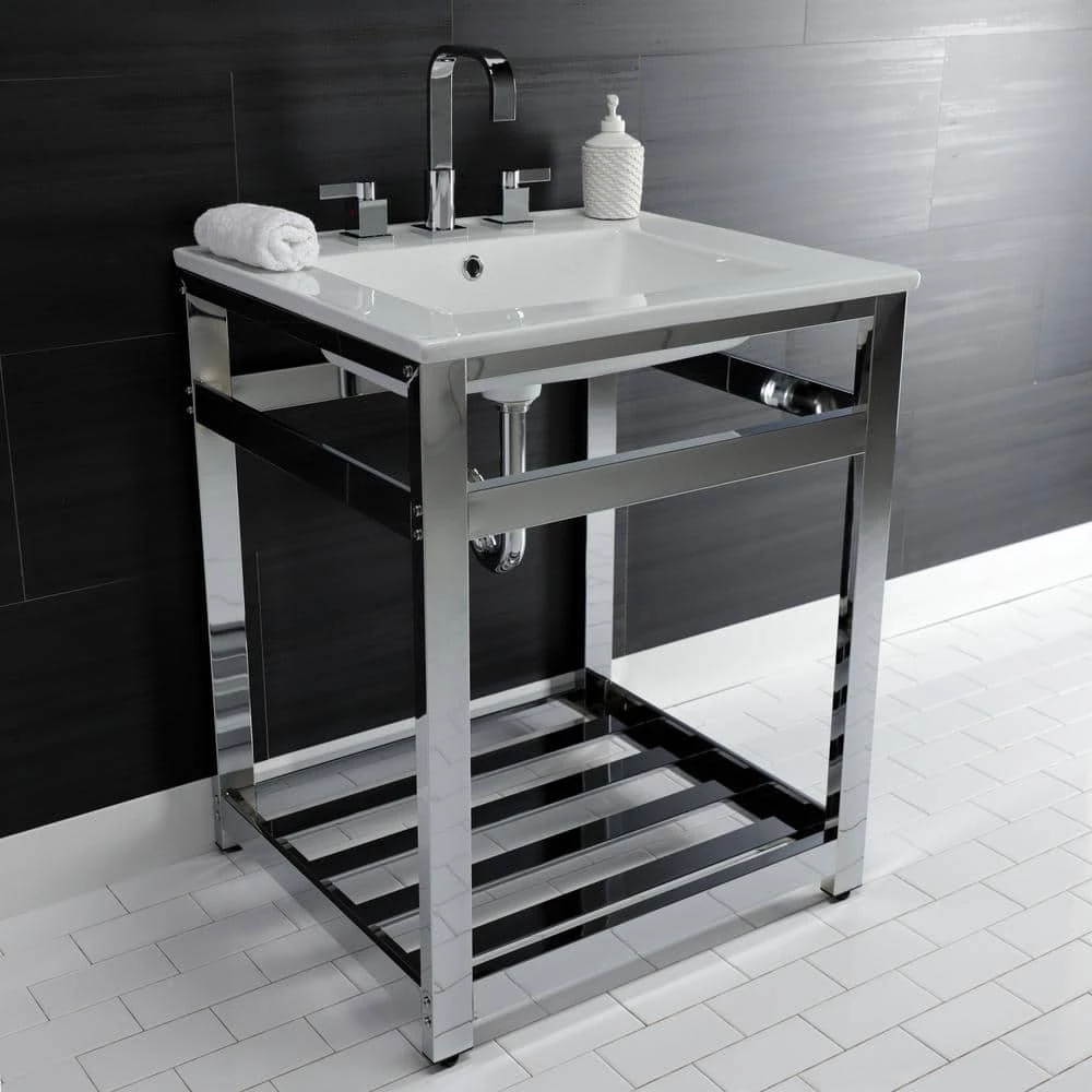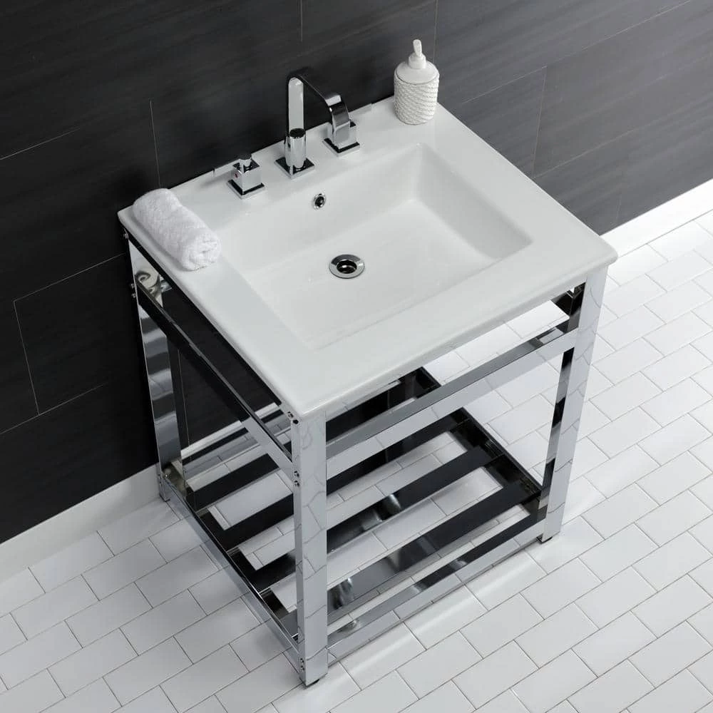 Exquisitely styled for your contemporary taste, this console sink will enhance your bathroom living space. With a beautiful ceramic counter top, this console sink set is a long lasting, durable, and elegant addition to your bathroom. The Kingston Brass 25 in. ceramic console sink (8 in., 3-hole) features a wash basin and steel base that is available in a handful of finish options. Their pristine, stain-resistant surface and glistening finish make for a very sturdy fixture that is easily maintained. Water supply kit, drain assembly, and the faucet are sold separately.