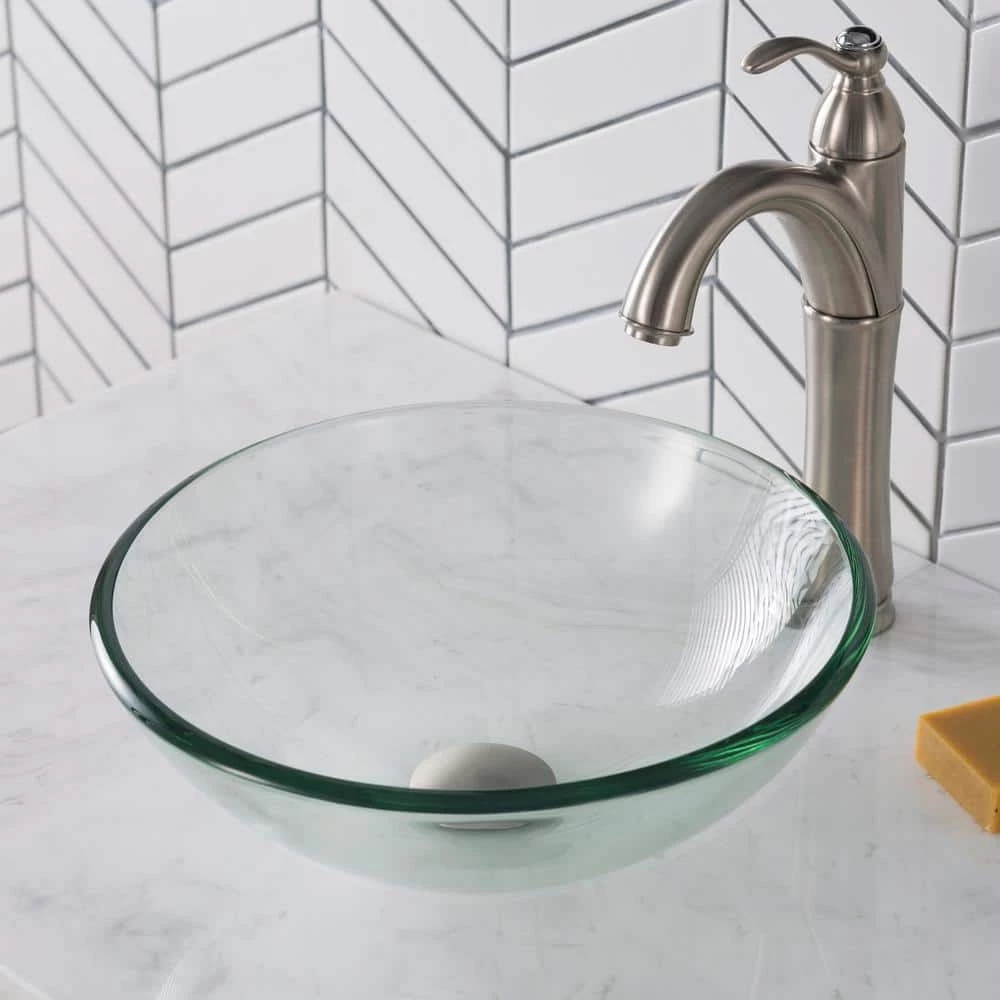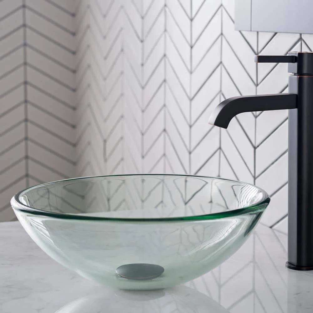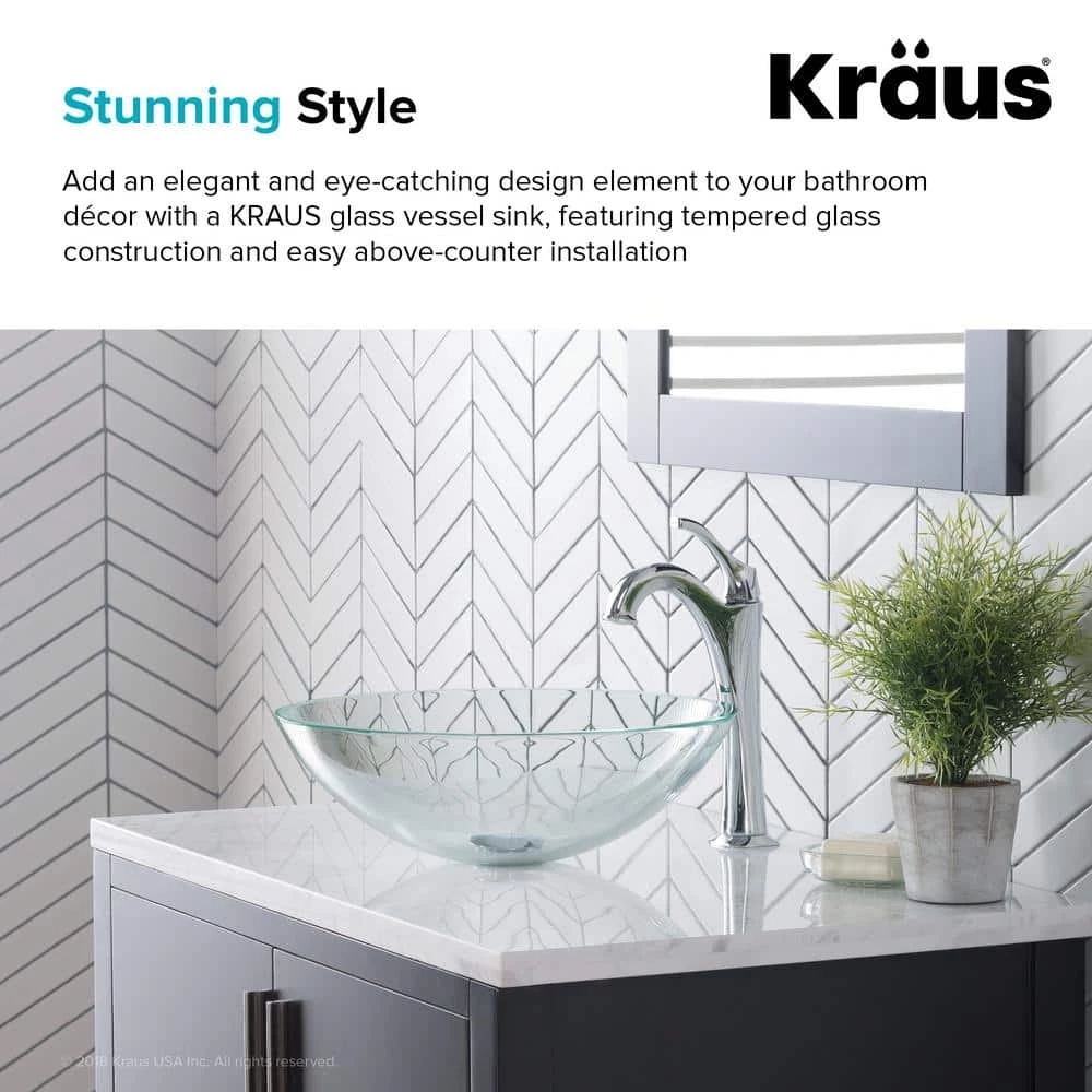 Add a touch of elegance to your bathroom with a KRAUS clear glass vessel sink. Handcrafted from tempered glass, this modern bathroom sink coordinates with a variety of decor styles. A freestanding basin design creates a dramatic look with contemporary appeal. The smooth, polished surface is beautiful and requires minimal maintenance to keep clean. This versatile sink can be installed above-counter for all your stylish bathroom ideas.