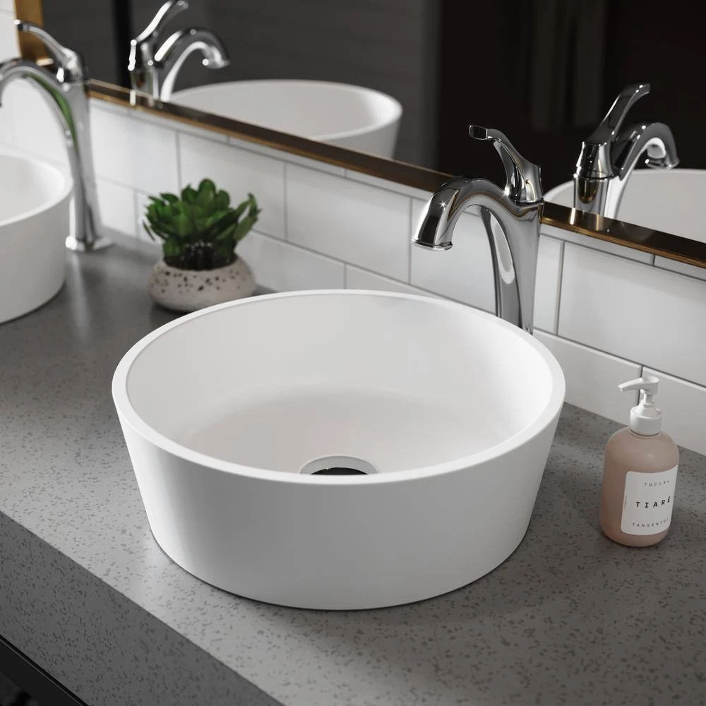 Add a beautiful accent to your bathroom with Natura Series sinks in elegant white matte finish. Contemporary silhouettes with slender edges offer a light, airy, and luminous look, giving your bathroom a fresh new appearance with highly desirable modern appeal. Made from unique mineral composite material, these sinks combine the best of nature and technology to provide unparalleled strength and resistance to impact. For added durability, the non-porous sink surface is enhanced with innovative Nano technology, making it easy to clean and impervious to scratches, stains, and water spots. Above-counter installation works with any countertop, and makes an eye-catching style statement while maximizing space on the bathroom vanity.
