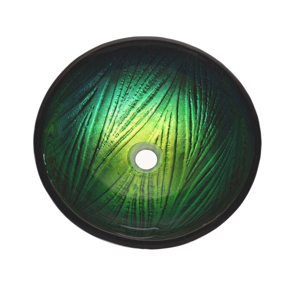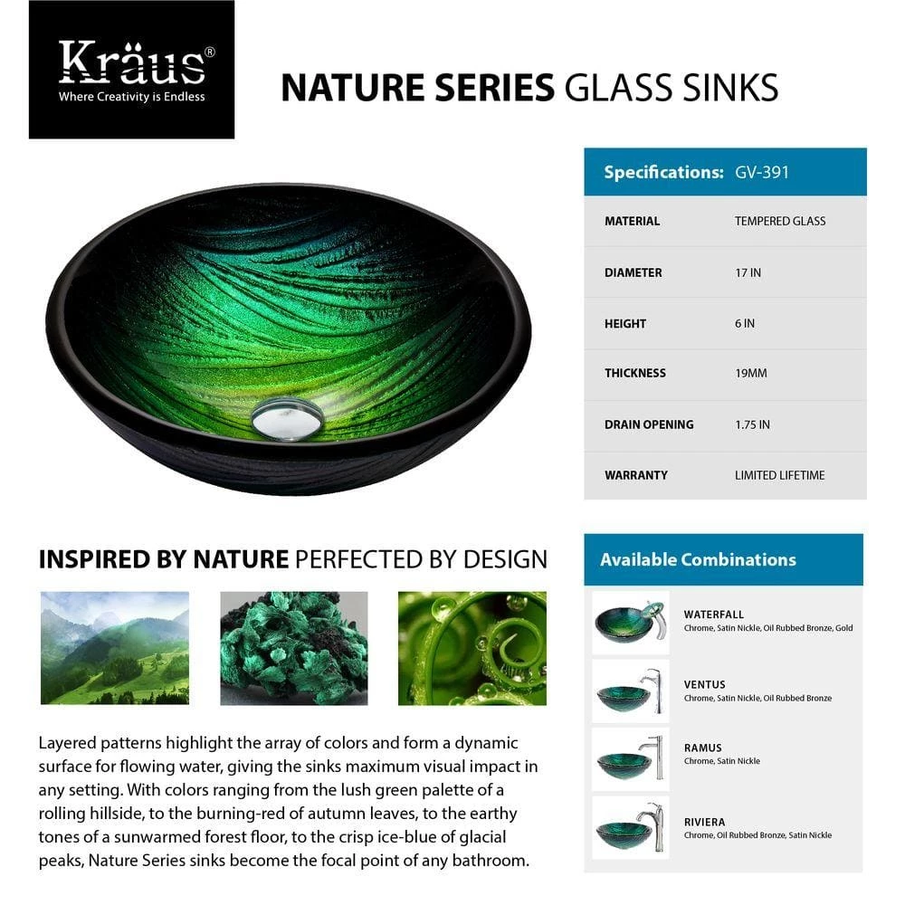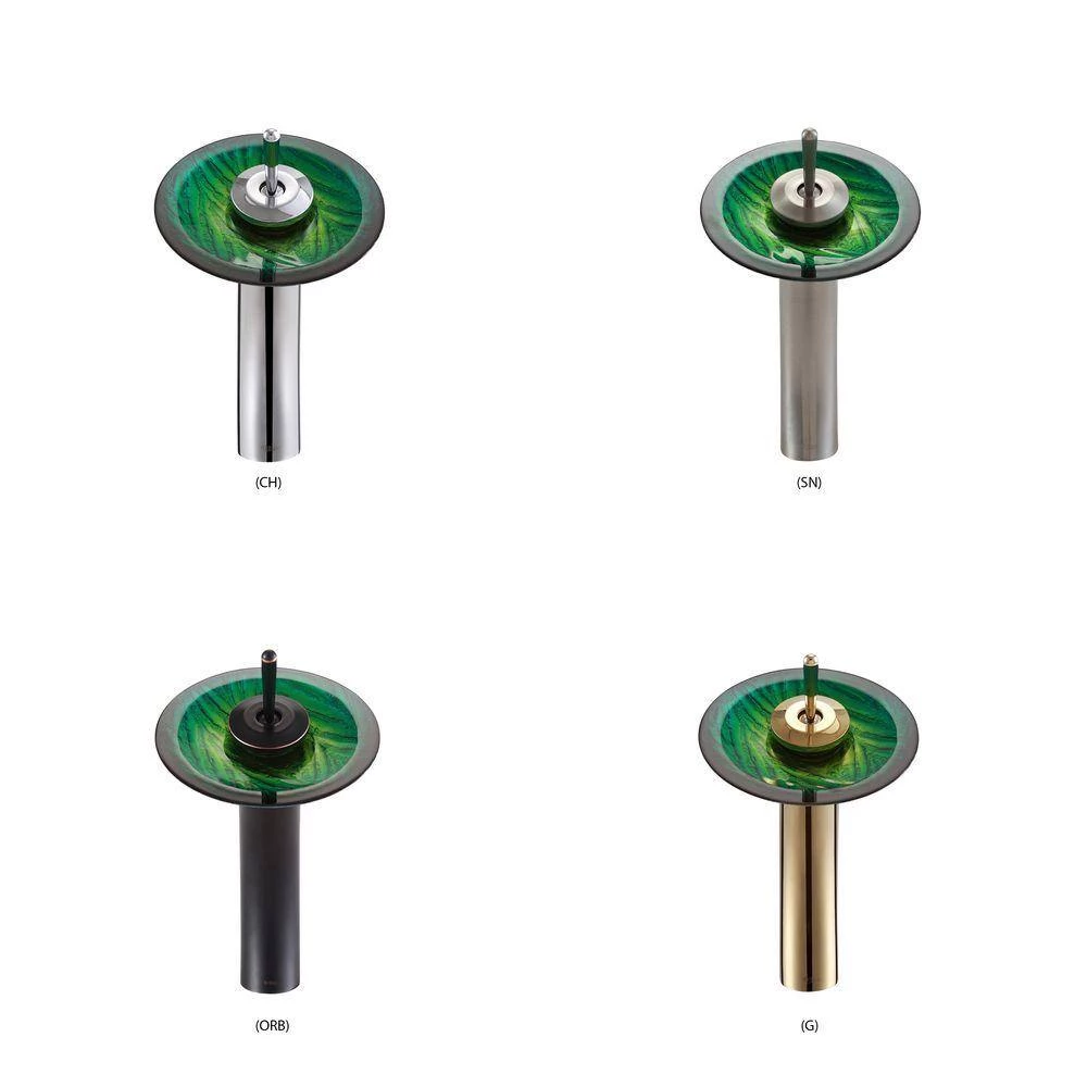 KRAUS Nei Glass Vessel Sink in Green with Waterfall Faucet in Satin Nickel