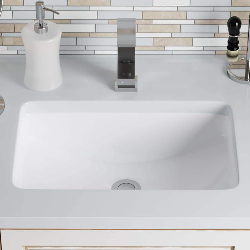 The U1913-White porcelain under mount sink is made from true vitreous China which is triple glazed and triple fired to ensure your sink is durable and strong. Under mounting a bathroom sink creates a sleek look and allows for more space on your countertop. The overall dimensions for the U1913-White are 20-3/4 in. x 14-3/4 in. x 7-3/4 in. and requires a 24 in. minimum cabinet size. Pop-up drains in a variety of finishes are available with this sink model. As always, our porcelain sinks are covered under a limited lifetime warranty for as long as you own the sink.