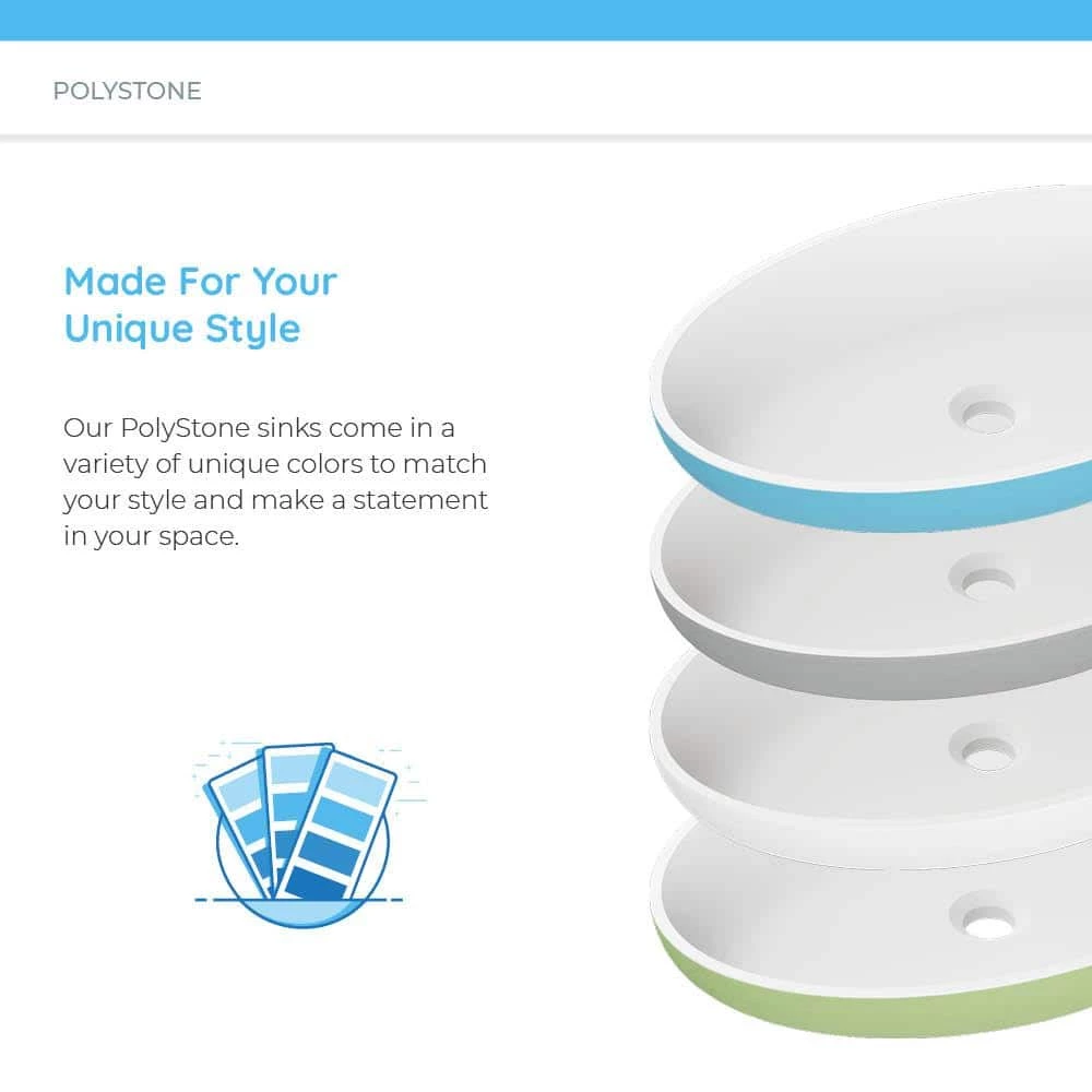 The PolyStone Oval Vessel Sink makes a refined and practical addition to any bathroom. Its smooth curves and deep interior provide a subtle grace that complements both modern design and traditional decor. Molded with a unique blend of polyurethane and natural minerals, this sink provides long-lasting durability and features an attractive, smooth basin and textured exterior. The dimensions of the sink are 23 in. x 15 in. x 4-3/8 in. and a 24 in. minimum cabinet size is required. Additionally, both a 731-BN faucet and a vessel pop-up drain are included. The 731-BN is a single handle vessel faucet with a solid brass waterway construction. The drain opens and closes with a simple press to its attractive brushed nickel cap.