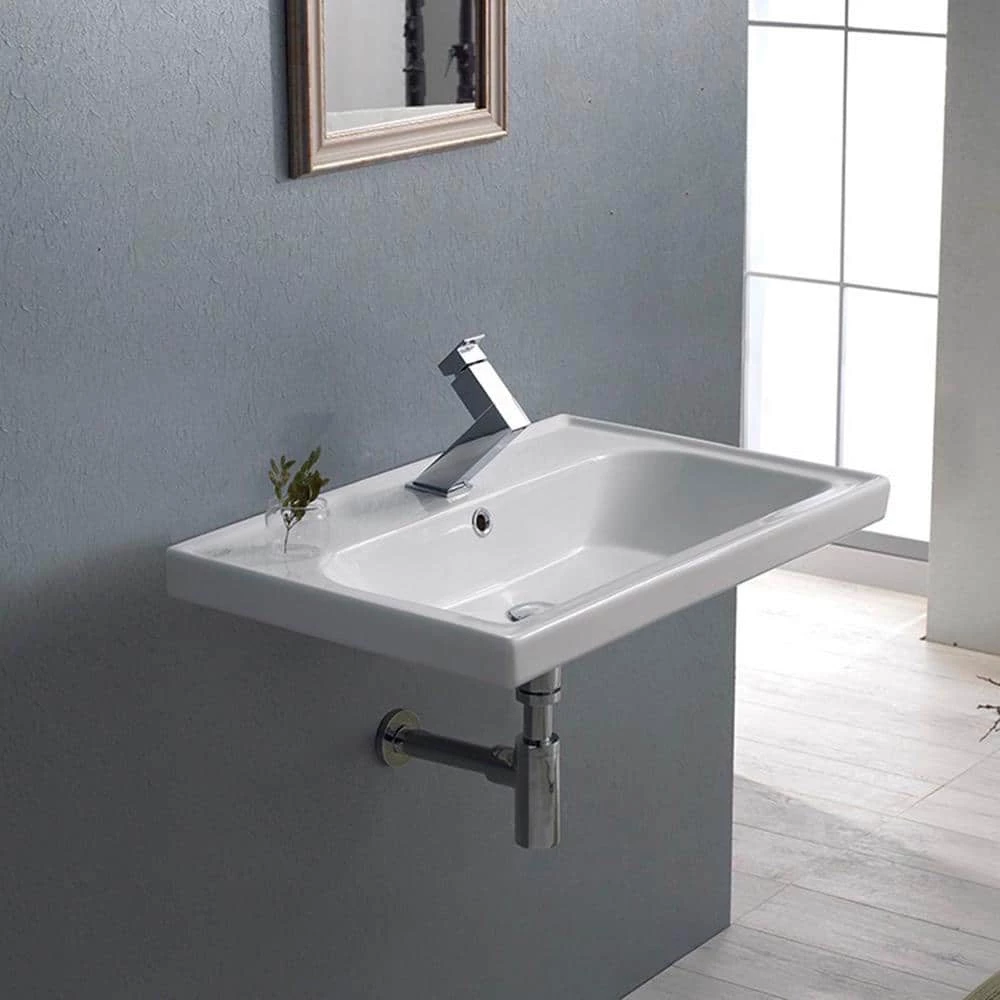 Rectangle white bathroom sink made from high quality ceramic. Contemporary style sink with wall mounted mounting. Sink has 1 pre-drilled faucet hole. Part of the CeraStyle frame collection. Made in turkey.