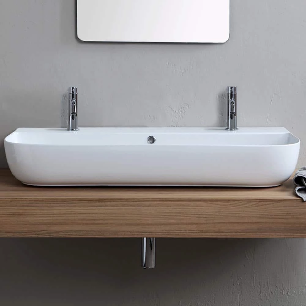 Perfect for the modern or contemporary bathroom atmosphere, this 37.5 inch bathroom sink is made from built-to-last white ceramic with an ultra thin edge. This sink can be used as a wall mounted sink or a vessel sink and features two pre-drilled faucet holes. Made in Italy by Scarabeo and part of the Glam collection.