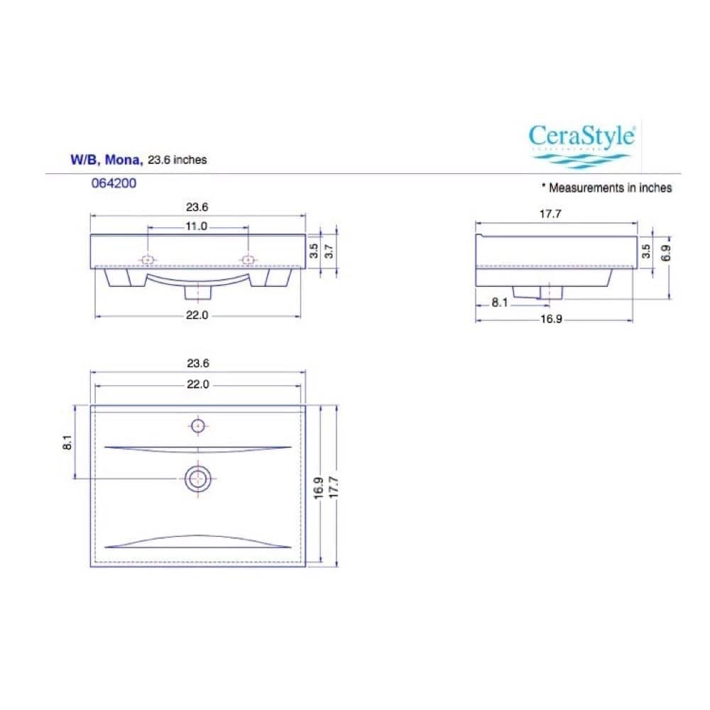 23.6 in. wall mounted or self-rimming bathroom sink with 3 pre-drilled faucet hole and an overflow. This sleek sink is perfect for modern and contemporary settings. Sink is made out of high-quality ceramic and designed by well-known Turkish brand CeraStyle.