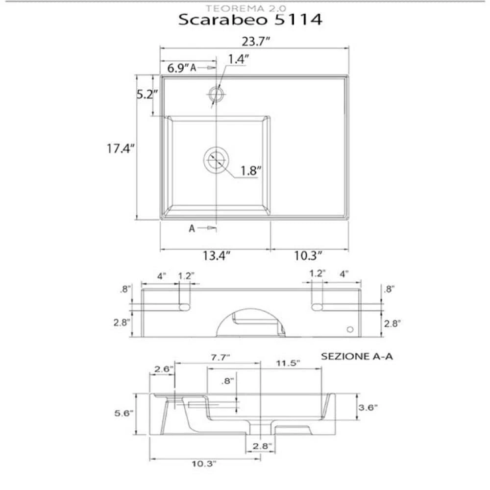 From the Italian designer Scarabeo, this white ceramic sink is part of the Teorema 2.0 collection. Available in 3 hole application and equipped with plenty of counter space. It is functional as a wall mounted or vessel application and is perfect for the modern bathroom design.