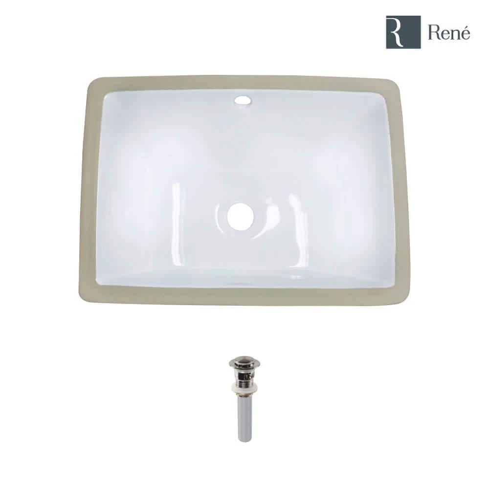 This attractive white porcelain basin is designed to be mounted under the counter in a flush, positive, or negative reveal. The R2-1007-W is constructed of solid porcelain but with a special additional enamel added at the end of its firing, turning it into a hardened true Vitreous china. On its own, porcelain is both beautiful and durable, but the additional Vitreous china coating creates an even more impervious and sanitary surface. This rectangular basin measures 18-1/4 in. x 13 in. x 7-7/8 in., with a centerset drain and overflow. Included is a spring-loaded pop-up drain which can be opened or closed with a simple press to its brushed nickel dome.