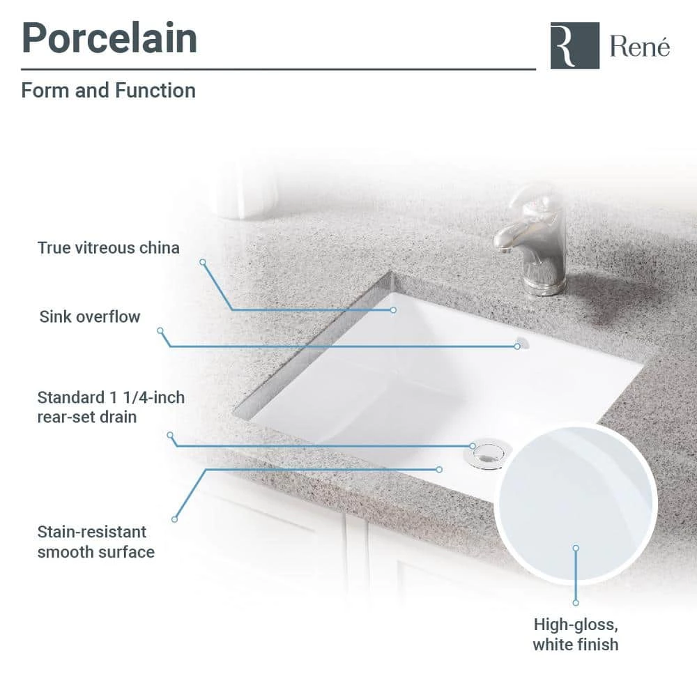 This attractive, white, porcelain basin is designed to be mounted under the counter in a flush, positive, or negative reveal. Wide and narrow, its vitreous china finish glistens with charm and durability. The R2-1003-W is constructed of solid porcelain but with a special additional enamel added at the end of its firing, turning it into a hardened, true, vitreous china. On its own, porcelain is both beautiful and durable, but the additional vitreous china coating creates an even more impervious and sanitary surface. It measures 17 in. x 17-1/2 in. x 7-1/2 in., with an offset drain and overflow. With a simple press to its handsome, brushed nickel dome; the included, spring-loaded, pop-up drain (pud) can be opened or closed.