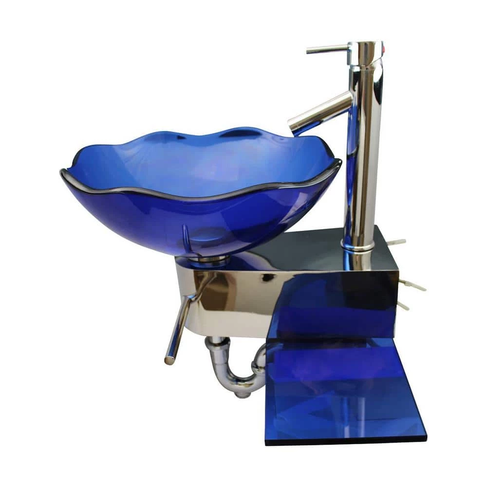BLUE LOTUS TEMPERED GLASS WALL MOUNT SINK COMBOAdd a touch of elegance to your bathroom with our modern and stylish round blue lotus style tempered glass wall mount vessel sink combo. This easy clean, smooth surface sink is manufactured of high strength tempered glass and leak proof ceramic cartridge. It is coupled with all chrome plated stainless steel hardware – Faucet, Pop Up Sink Drain and Towel Bar. Sophisticated yet compact metropolitan glass sink!FEATURES- Modern and Stylish Unique Small Blue Lotus bowl Sink – Smooth Glass Surface is Easy to Clean Up – Stainless steel Faucet and Towel bar in Chrome Finish is Stain and rust Resistant – Tested leak proof ceramic cartridge is used – All mounting hardware is provided with the pack for easy installation – Made of Resistant and solid high quality tempered glass materialSPECIFICATIONS- Material = Tempered Glass – Sink Type = Wall Mount Sink – Installation Method = Wall Mount – Shape = Round – Color = Blue – Sink Dimension = 16 inches x 6 inches – Overall = 19.5 Inches Projection x 23.25 Inches Wide x 6 Inches Deep.BUILT WITH LOVERenovators Supply Unique Blue Lotus Wall Mount Sink is a modern look that brings a unique flair to any bathroom setting. All of these are carefully wrapped and packed separately to avoid any scratches during the transition.