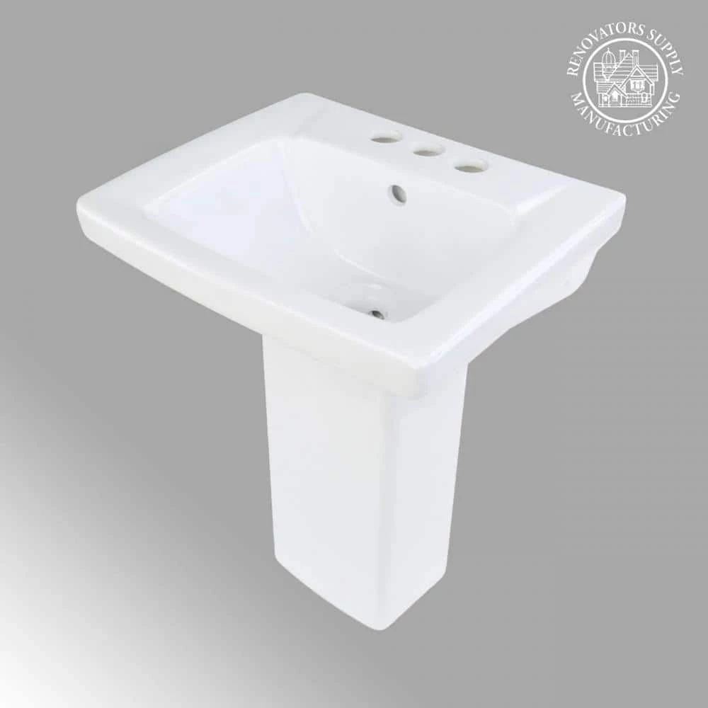 WEEWASH CHILD SIZE WHITE VITREOUS CHINA PEDESTAL BATHROOM SINK ; The WeeWash child’s pedestal sink from Renovators Supply Manufacturing features a sleek modern design and easy to clean Porcelain construction. While renovating your home, you cannot just ignore your kids’ requirements. You need to be extra careful in choosing the bath supplies for your kids needs and our WeeWash Child-size Pedestal Sink is perfectly designed for such bathrooms, thereby helping your kids do their bathroom stuff at much ease. FEATURES – Child Size White Pedestal Sink – Has a perfect height for children – Scratch and Stain Resistant Reno-Gloss Finish – Open-back pedestal sinks hide pipes and make installation a breeze – Constructed from gorgeous White Grade A Vitreous China Porcelain – Authentic Renovator’s Supply logo guarantees better quality than the knockoffs ; DIMENSIONS Overall: 21-1/2 Tall x 16 Wide x 12-3/4 Proj. Basin: 4 Deep x 16 Wide ; GIFT YOUR KID SOMETHING THAT BUILDS THEIR PERSONALITY; These Pedestal sinks can enhance the look of any bathroom, irrespective of the existing theme. They not only give an elegant look to the bathroom but also saves space for other treatments as well. These are the most preferred sink designs by home renovators, especially in white color. ; HARDWARE- Accepts 4”Centerset faucet (not included)- Lag Bolts (not included) ; WHAT’S INCLUDED – One (1) WeeWash Porcelain Sink and a Pedestal Leg Support ;