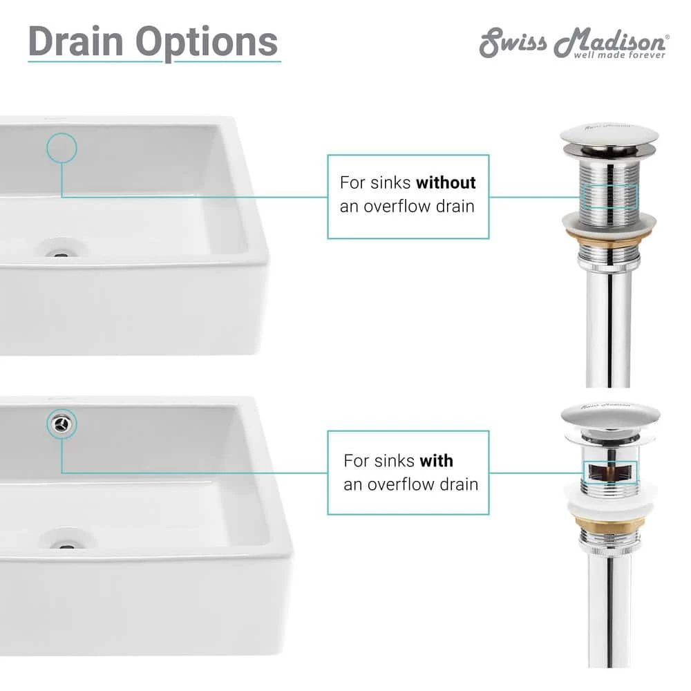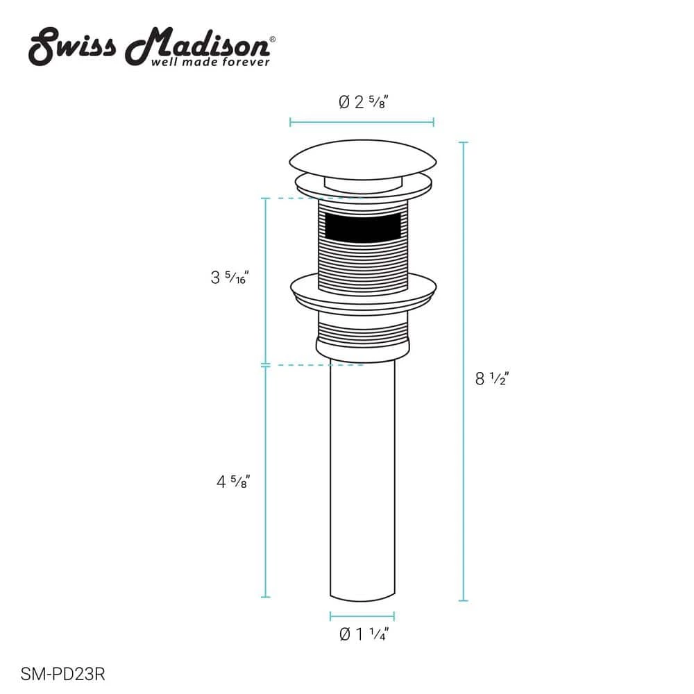 A modern and sleek drain for Swiss Madison brand sinks. Our pop-up drain adds sophistication and convenient operation to any bathroom sink. Simply pressing the drain allows it to open and close.