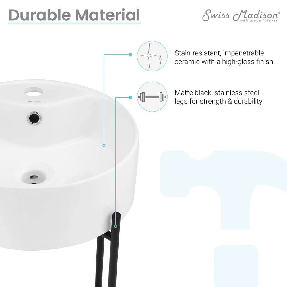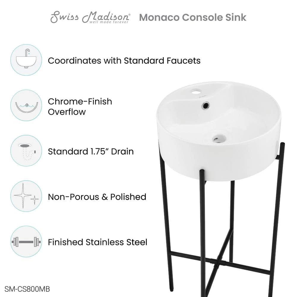Monaco console sink is a complimentary selection for any bathroom. The 2-piece, freestanding design features a matte black stand with a circular basin and built-in singular faucet hole that offers a unique take on a classic style. Crafted from durable ceramic, the Monaco will not only look beautiful, but will remain so for many years.