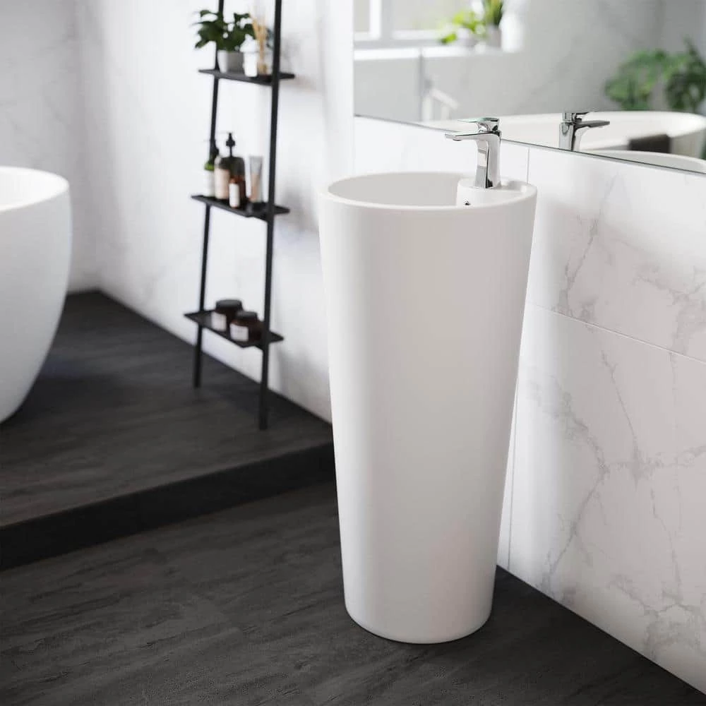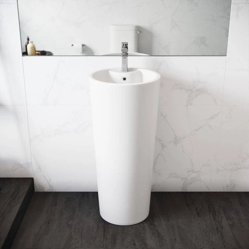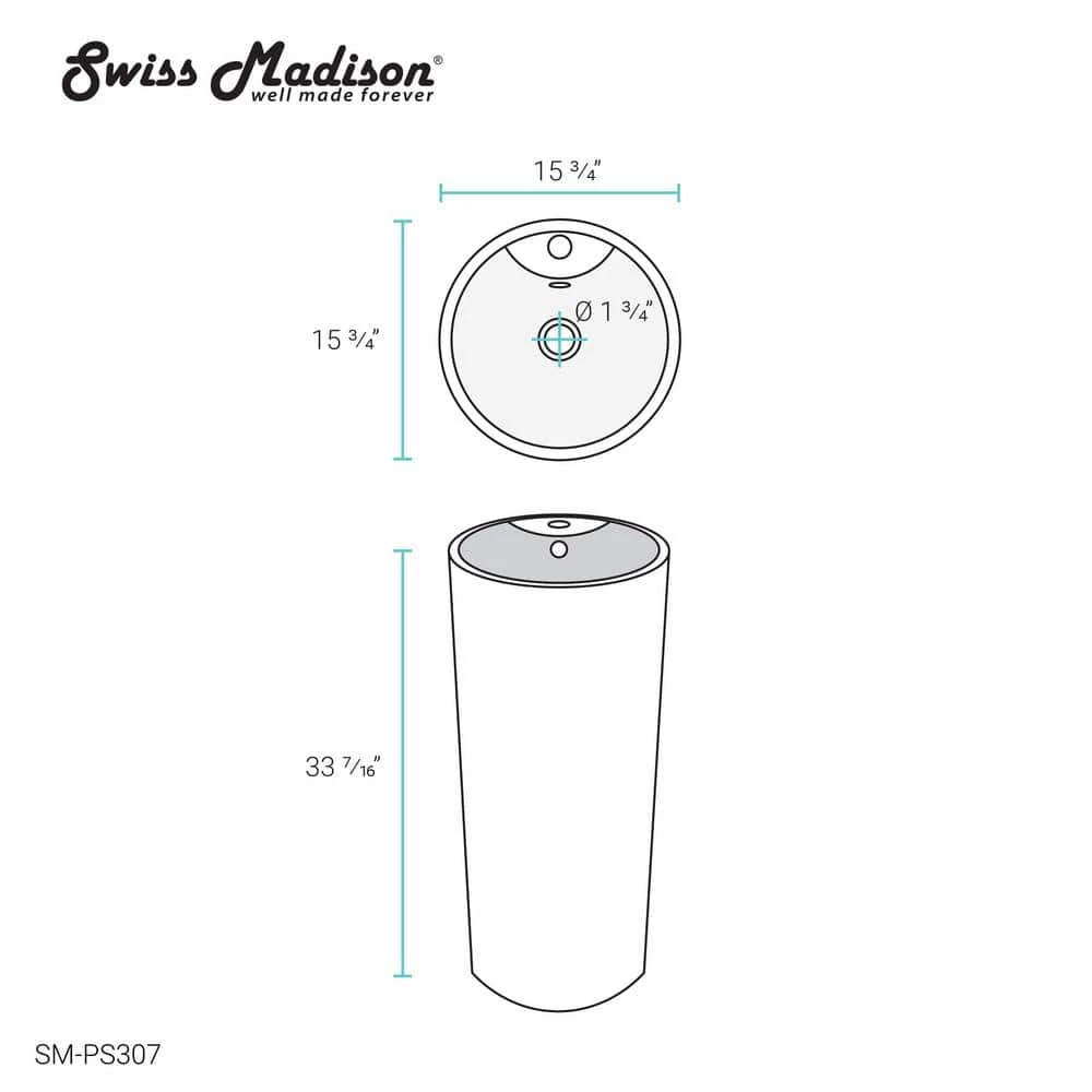 The solid freestanding one-piece design of Swiss Madison’s Monaco pedestal sink is a modern look that brings a unique flair to any bathroom setting. The sink is constructed of durable ceramic for a long-lasting fitting. It’s seamless finish provides a smooth surface for superior shine and easy cleaning.