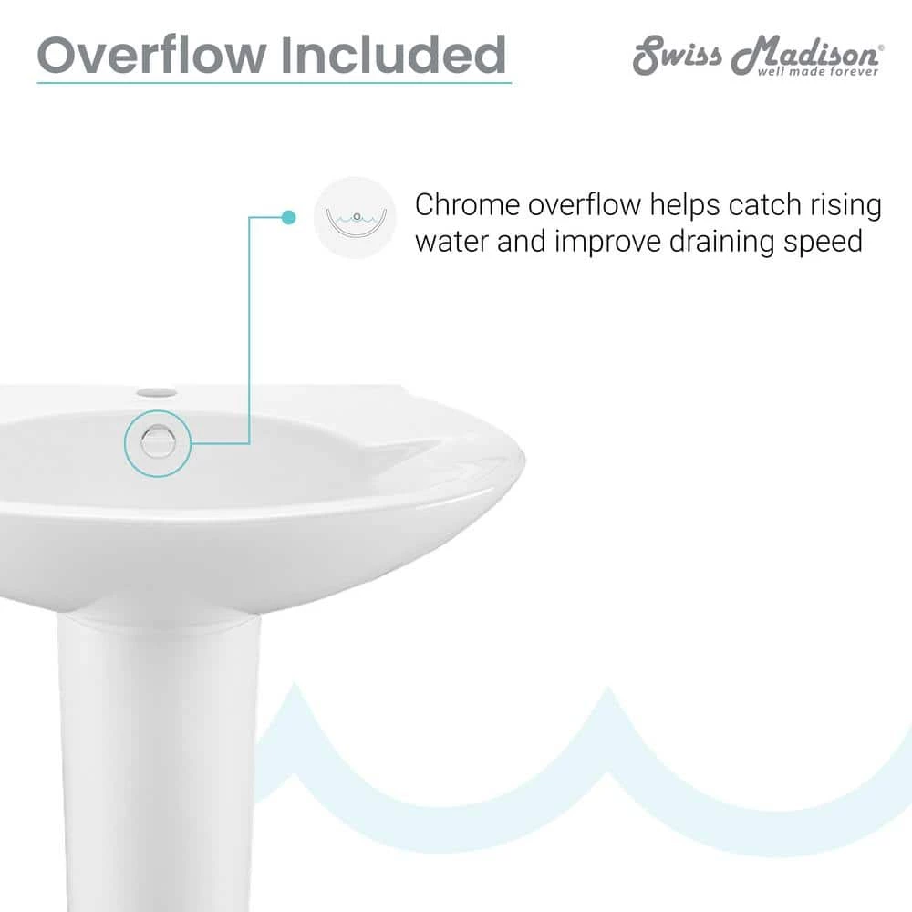 The solid freestanding two-piece design of Swiss Madison’s Sublime pedestal sink is a modern look that brings a unique flair to any bathroom setting. The sink is constructed of durable ceramic for a long-lasting fitting. It’s finish provides a smooth surface for superior shine and easy cleaning. Easy to install and simple to clean. High Gloss finish protects the sink from scratches and stains. Smooth sides make the sink easy to clean and elegant to the eye. Overflow drain included. 1 Year Limited Warranty Included. Dimensions: 22.5 x 17.5 x 32