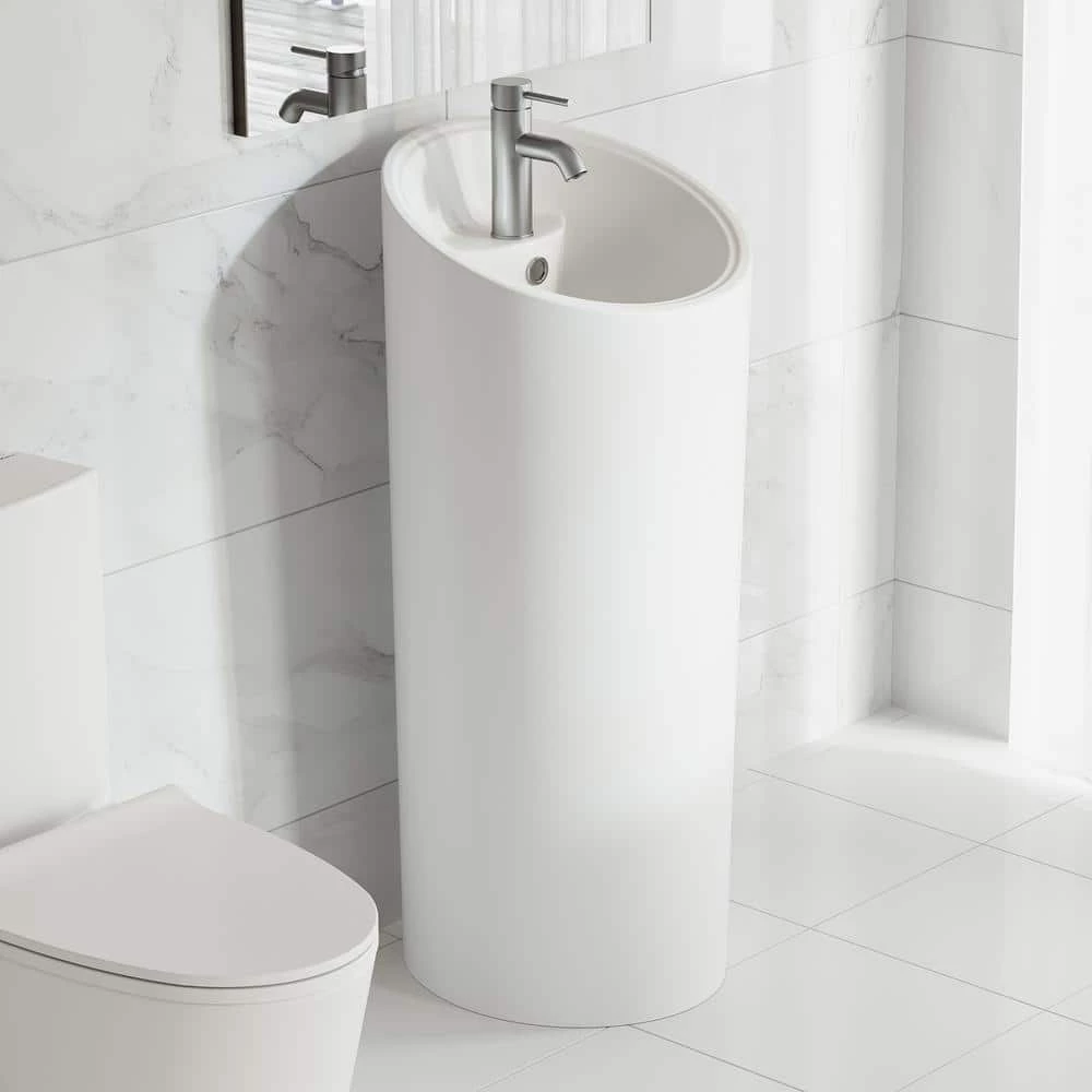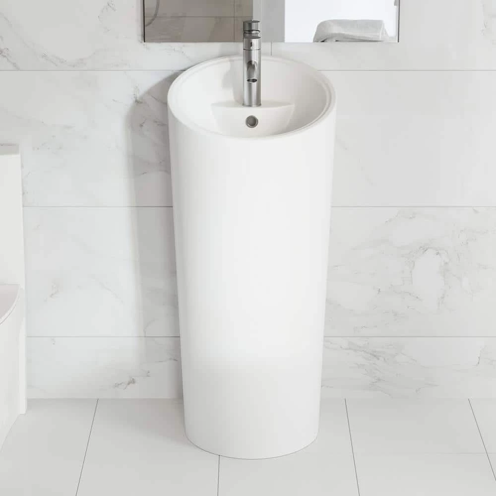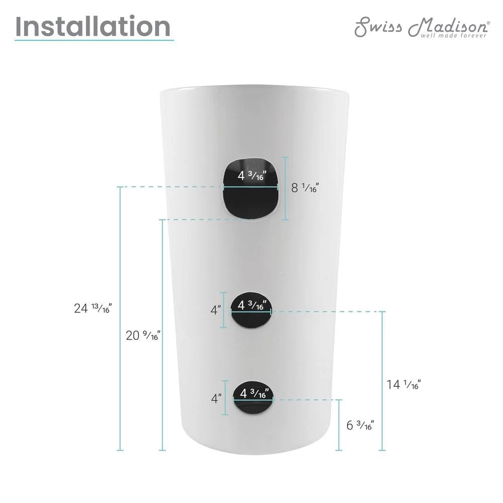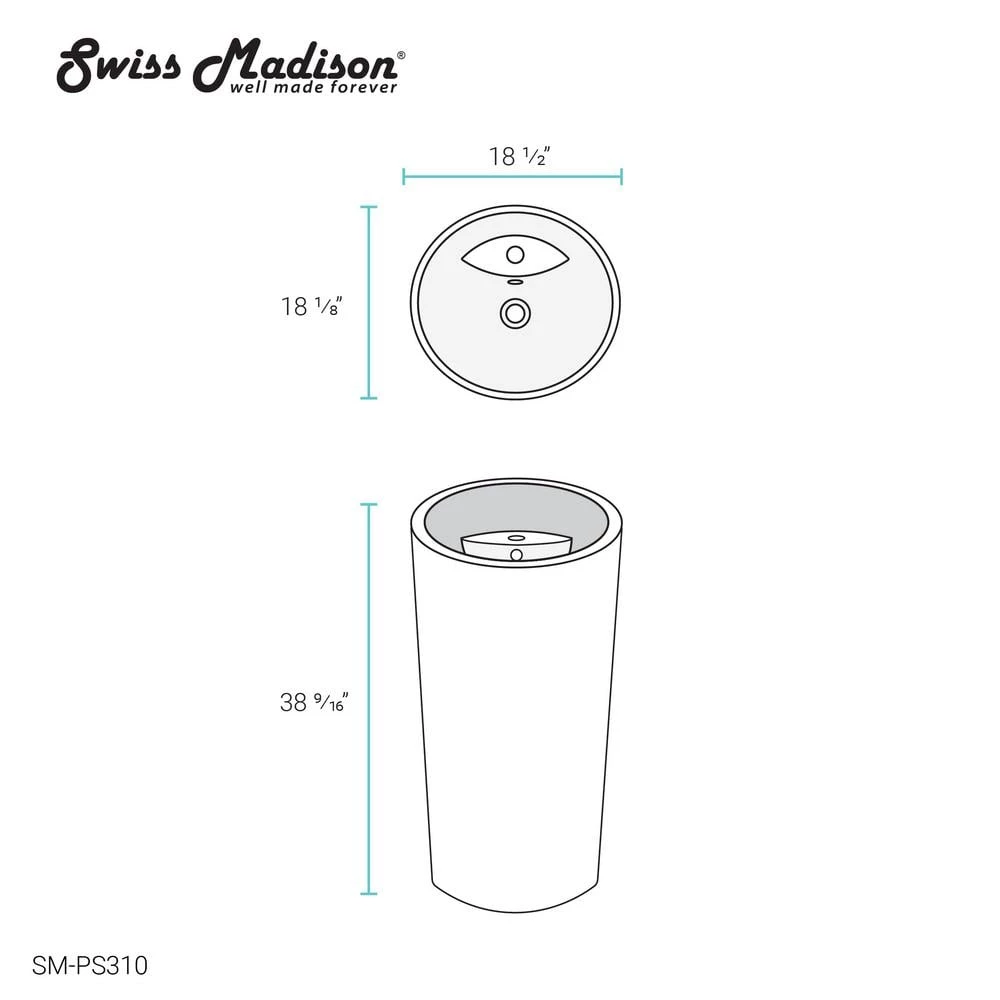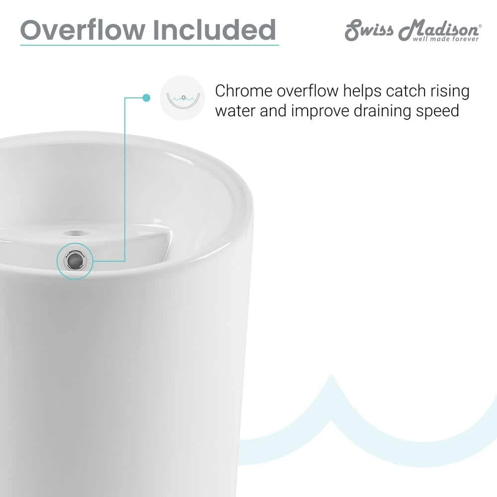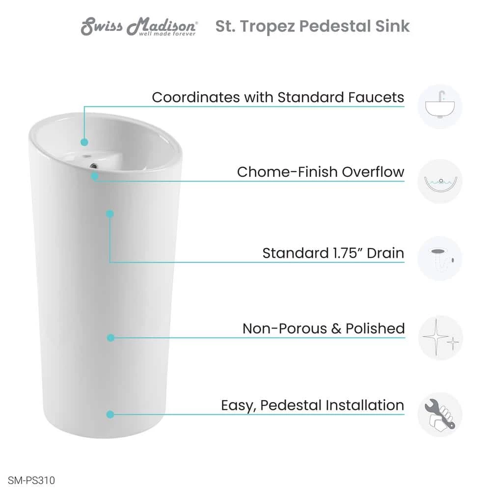 The solid freestanding one-piece design of Swiss Madison’s St. Tropez pedestal sink is a unique look that brings a sumptuous touch to any bathroom setting. The sink is constructed of durable ceramic for a long-lasting fitting. It’s finish provides a smooth surface for superior shine and easy cleaning. Easy to install and simple to clean. High Gloss finish protects the sink from scratches and stains. Smooth sides make the sink easy to clean and elegant to the eye. Overflow drain included 1 Year Limited Warranty Included Dimensions: 22.5 x 17.5 x 32