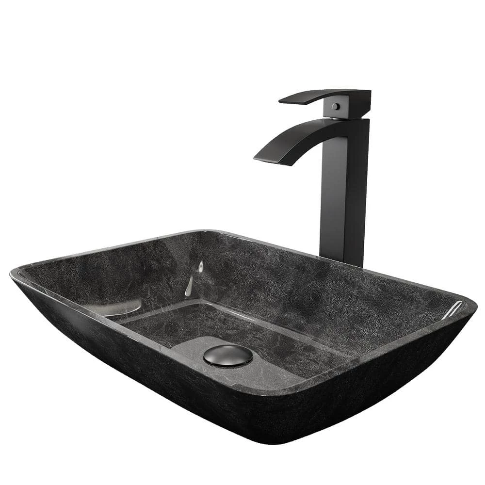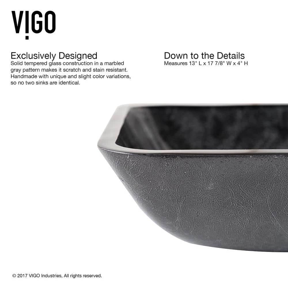 VIGO presents the Rectangular Gray Onyx Glass Vessel Bathroom Sink Set with Duris Vessel Faucet in Matte Black. The vessel sink is made from durable tempered glass. It has a textured, scratch-resistant exterior and a polished interior, making it easy to clean. Its handmade design leaves slight color variations that ensure no two sinks look alike. It pairs perfectly with the Duris vessel bathroom faucet in a matching finish. The faucet operates at a 1.2 GPM flow rate to conserve water. The water volume and temperature are operated by a single lever, making the Duris faucet usage effortless. It includes all mounting hardware, a matching finish pop-up drain, and hot/cold waterlines for hassle-free installation.