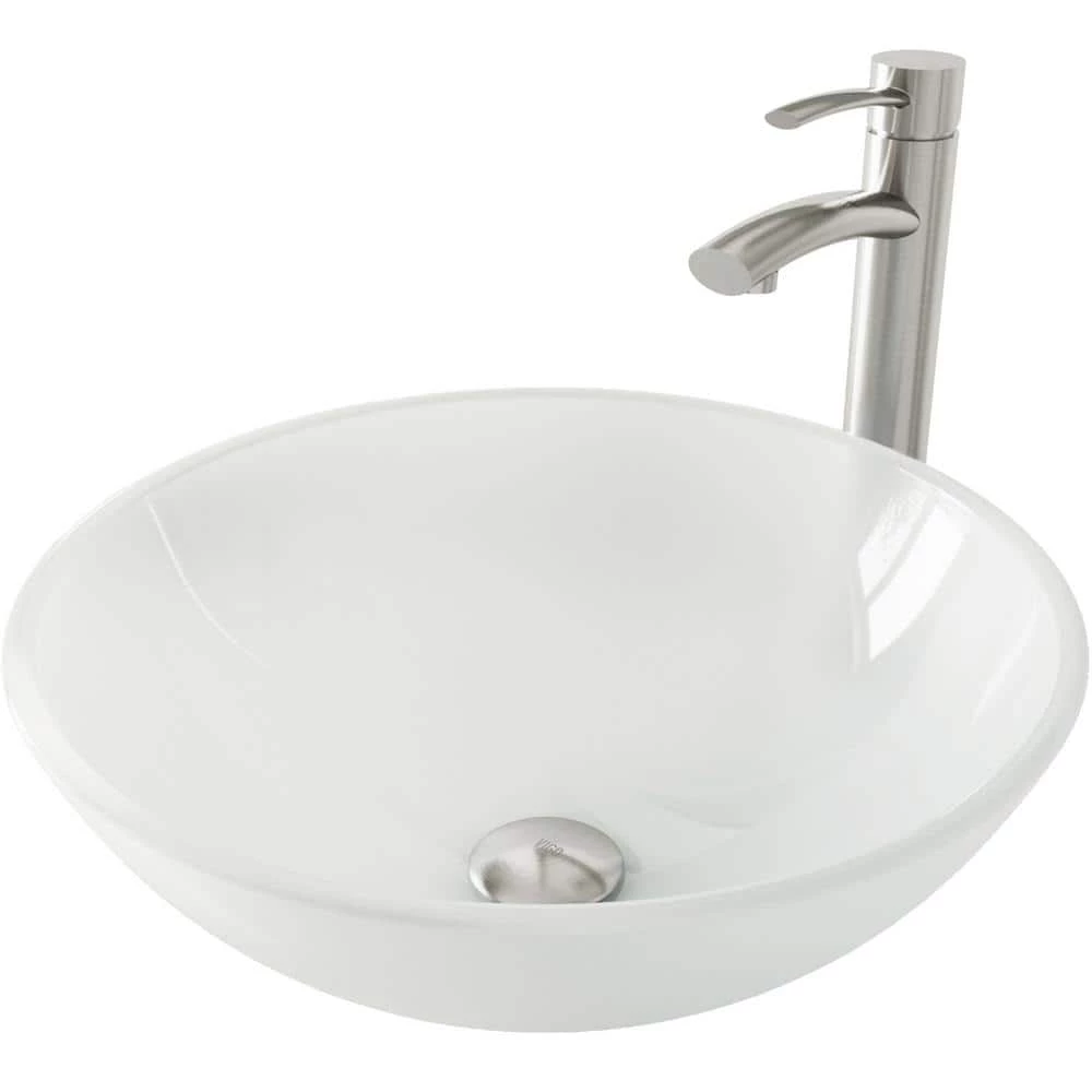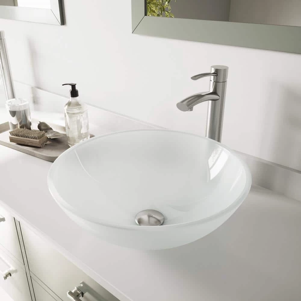 Cool as ice, the VIGO White Frost Glass Vessel Bathroom Sink Set with the Milo Vessel Faucet keeps things fresh. The durable, tempered glass sink resists stains and impact for optimal safety. It is paired with the fingerprint-free Milo Vessel Faucet in a Brushed Nickel finish. This faucet, made from solid brass and plated with 7 layers of finish durability, is the perfect complement for this set. A matching pop-up drain seamlessly ties all elements together.