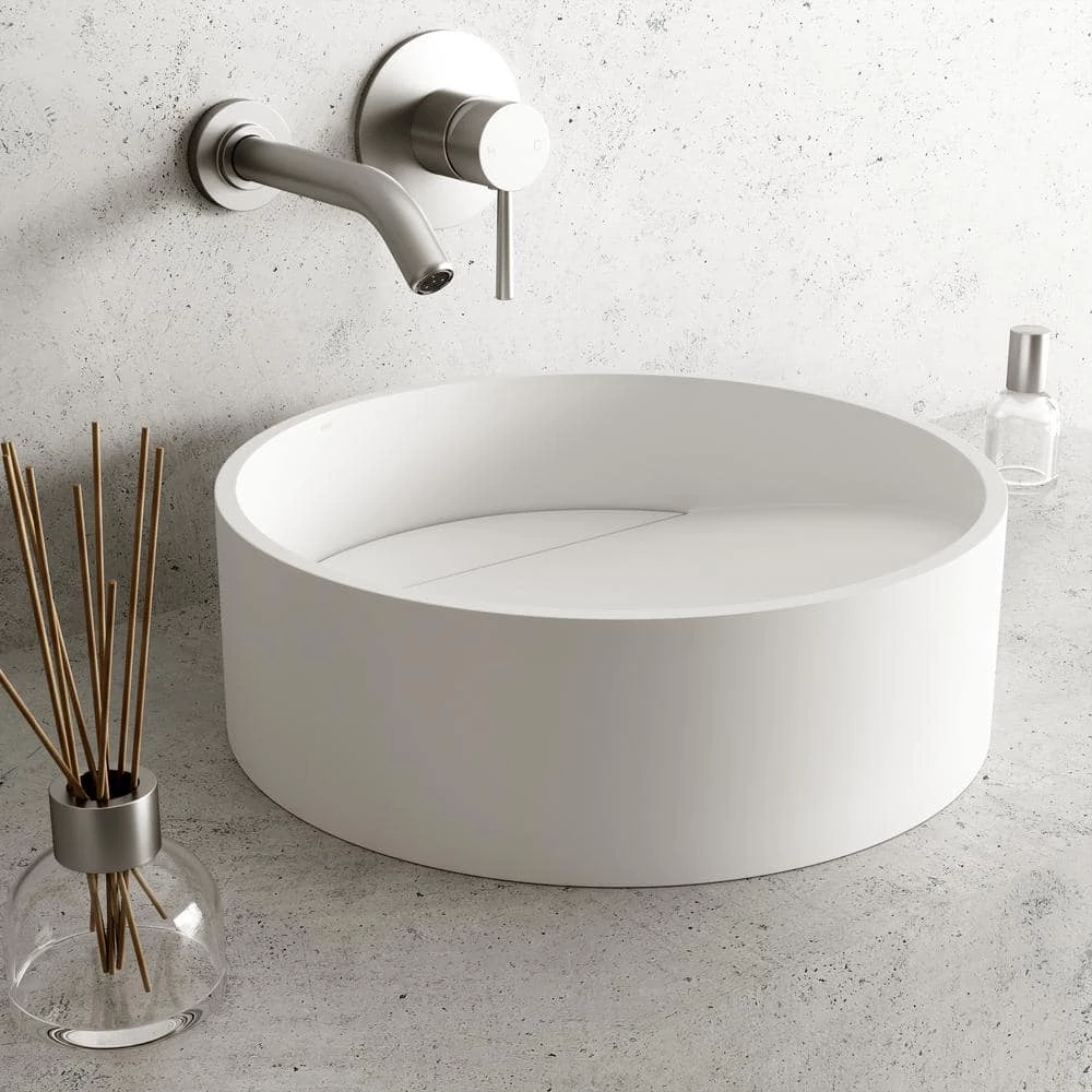 A round design shape and exclusive stone material distinguish The Starr by VIGO. Constructed from VIGO’s exclusive Matte Stone material, this vessel bathroom sink is solid-to-the-core, more robust and more durable than conventional vessel sink materials like fireclay or ceramic that chip and crack. Its unique stone material delivers a clean white color and a smooth to the touch surface. Its drain plate elegantly hides the drain and provides a flawless cleaning experience. The Starr matches innovation with style to create a highly functional art fixture for your bathroom.