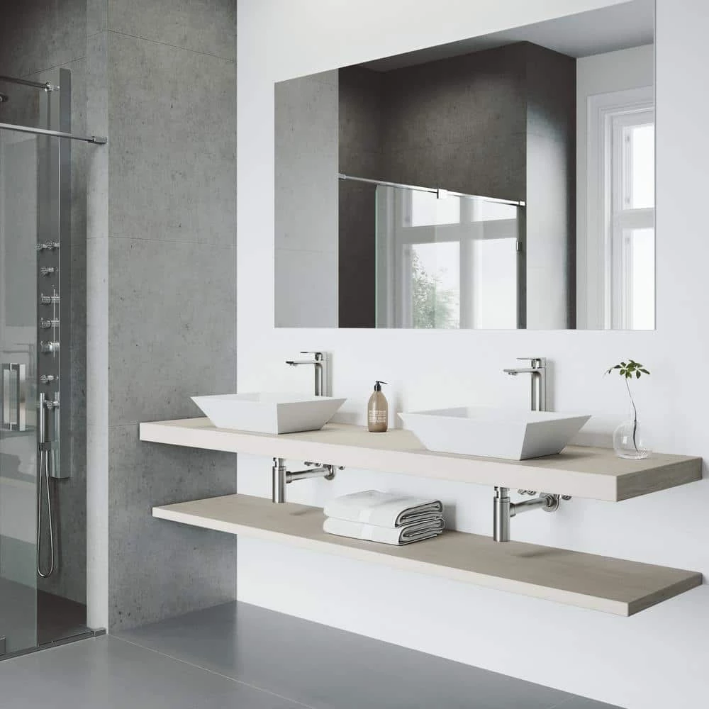 The shape may taper but the quality never diminishes with the VIGO Vinca Matte Stone Vessel Bathroom Sink Set with the Norfolk Faucet In Brushed Nickel. Designed both for aesthetic style and functional expertise this Matte Stone sink resists scratches, impact and discoloration. When paired with the 7-layer finished Norfolk Vessel Bathroom Faucet of which the construction is solid brass this sink’s quality is even more evident. A complementary pop-up drain completes this all-in-one bathroom sink set.